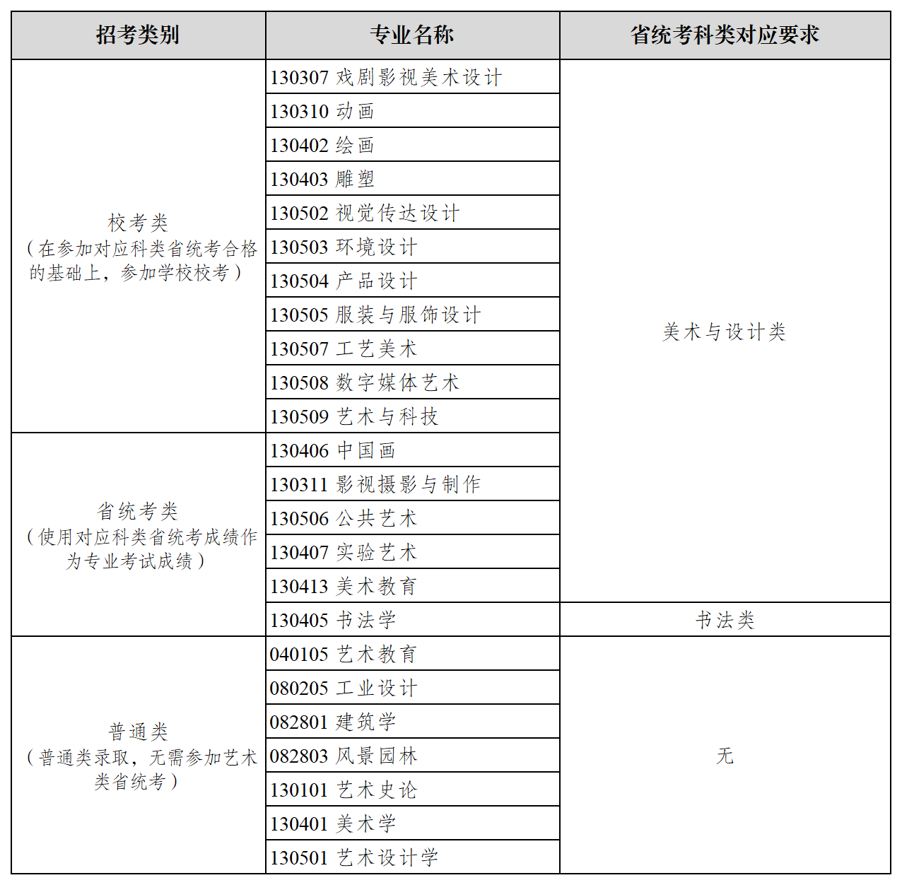 2026年四川美術(shù)學(xué)院本科招生專業(yè)、招考類別及省統(tǒng)考科類對應(yīng)要求如下,報考四川美術(shù)學(xué)院校相應(yīng)藝術(shù)類專業(yè)須按以下省級統(tǒng)考科類對應(yīng)要求參加相應(yīng)科類省級統(tǒng)考。